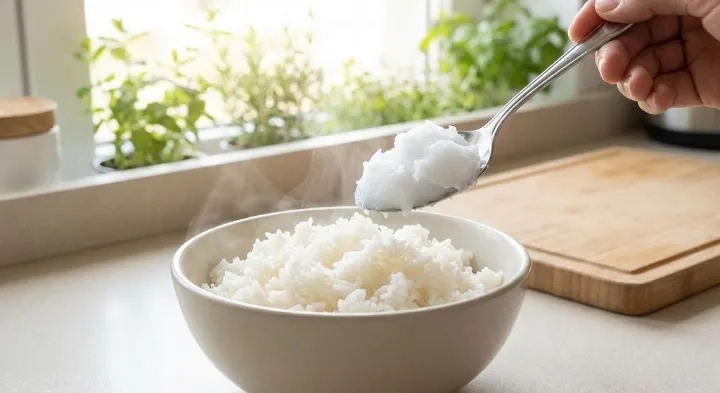 Step 1 (오일 코팅): 쌀을 씻어 밥솥에 넣을 때, 식물성 오일(코코넛 오일, 올리브유)을 1티스푼 넣습니다. 오일이 전분 입자를 코팅해 소화 흡수를 늦춥니다.