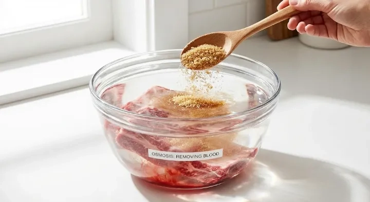물 1리터에 설탕 2큰술을 녹인 뒤 고기를 담가보세요. 설탕 분자가 고기 조직 사이로 침투하면서 농도 차이를 만들고, 이 삼투압 현상 덕분에 핏물이 일반 물보다 3배 빠르게 배출됩니다.