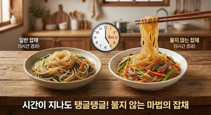 당면(고구마 전분)을 물에 삶으면 수분을 흡수해 부드러워지는 '호화' 상태가 됩니다. 하지만 시간이 지나면 수분을 뺏기며 다시 딱딱해지거나, 반대로 수분을 과도하게 머금어 퍼지게 되는데, 이것이 잡채가 맛없어지는 주원인입니다.