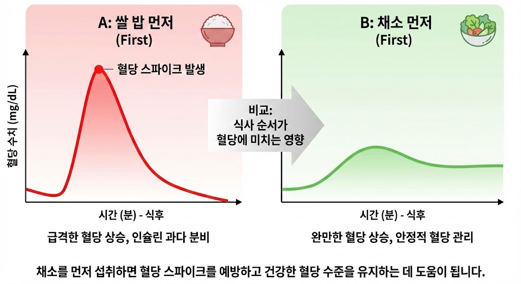 - 식사 순서: [채소 → 단백질 → 탄수화물] 순서만 지켜도 식후 혈당이 30% 낮아집니다.
